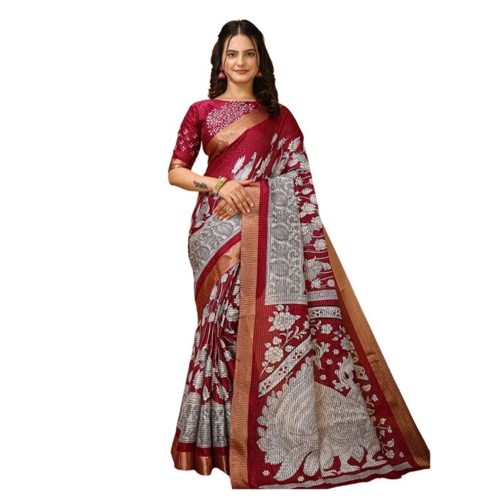 Women's Soft Handloom Cotton Kalamkari Printed Saree With Unstitched Blouse 5.5Mtr (Maroon)