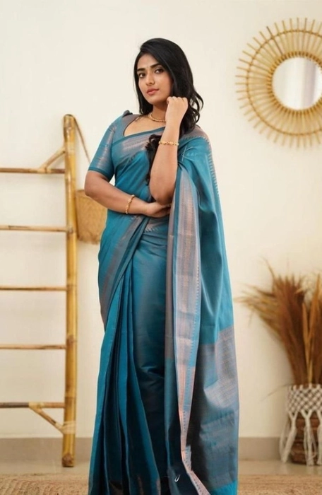 Women's Litchi silk Printed Saree With Unstitched Blouse (Rama Blue)