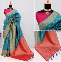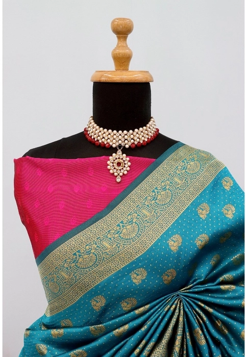 Women's Banarasi Printed Saree With Unstitched Blouse 5.5Mtr (Aqua Blue)