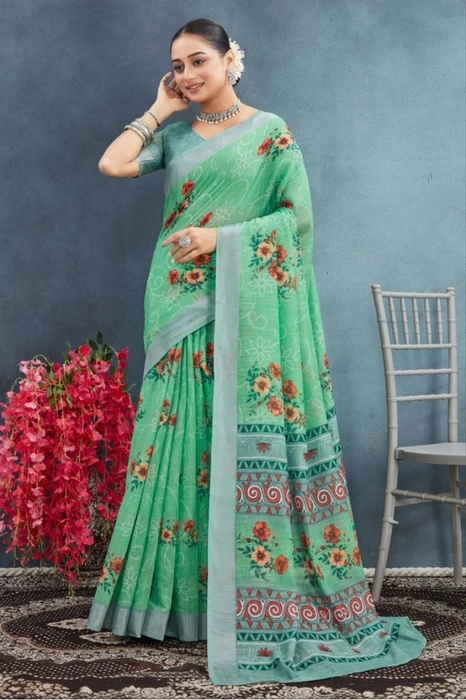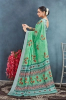 Women's Linen Floral Printed Saree With Unstitched Blouse 5.5Mtr (Green)