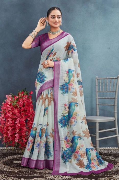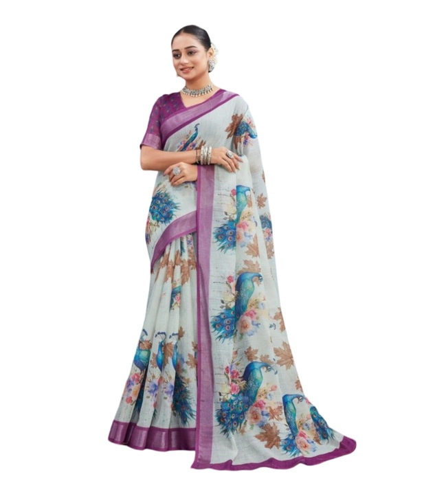 Women's Linen Floral Printed Saree With Unstitched Blouse