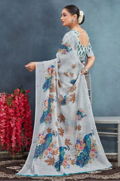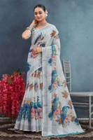 Women's Linen Floral Printed Saree With Unstitched Blouse
