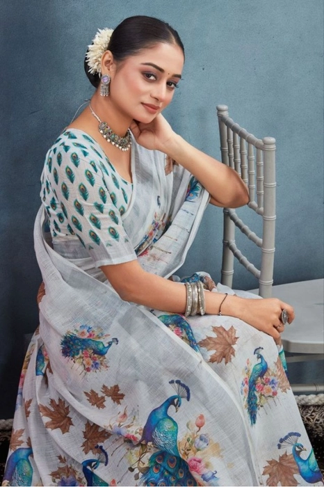 Women's Linen Floral Printed Saree With Unstitched Blouse 5.5Mtr (Off-White)