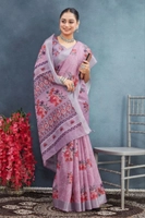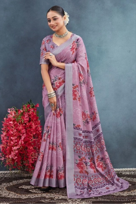 Women's Linen Floral Printed Saree With Unstitched Blouse 5.5Mtr (Purple)
