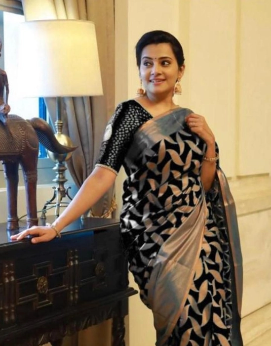 Women's Litchi silk Printed Saree With Unstitched Blouse (Black)