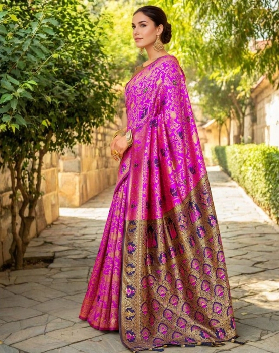 Women's Silk Blend Woven Paithani Saree With Unstitched Blouse 5.5Mtr (Pink)