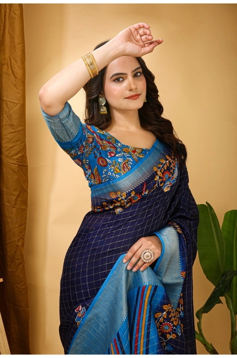 Women's Soft Dola Cotton Kalamkari Printed Saree With Unstitched Blouse 5.5Mtr (Navy Blue)