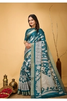 Women's Soft Handloom Cotton Kalamkari Printed Saree With Unstitched Blouse 5.5Mtr (Turquoise)