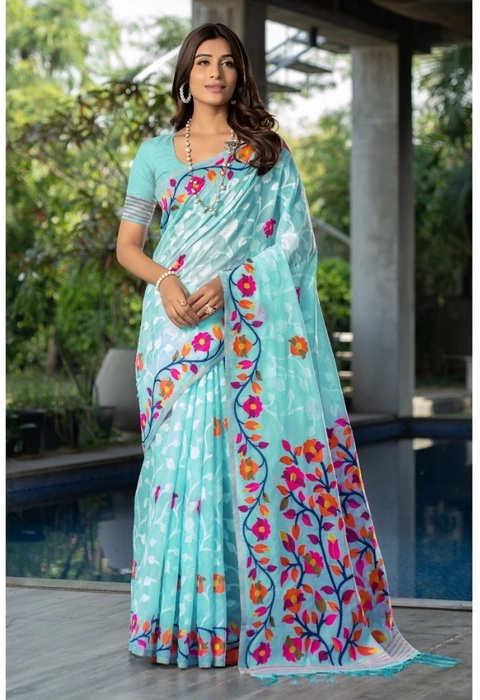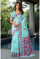Generic Women's Cotton Printed Saree With Unstitched Blouse (Sky Blue, 5-6 Mtrs)